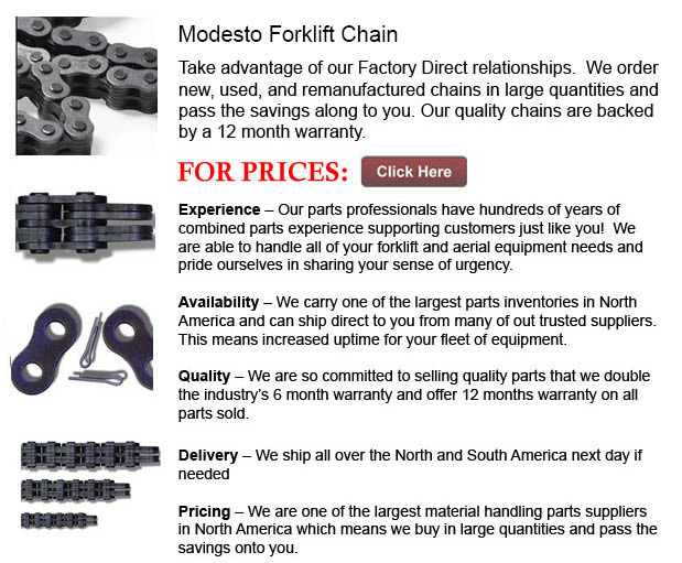 Lift Truck Chain Modesto - Modesto (population 201,165) is a city within the U.S. state of California. It is situated within Stanislaus County, for which it serves as the county seat. The city of Modesto is situated within the northern part of California, 148 km east of San Francisco. Fertile agricultural land surrounds this modest-sized city. The county of Stanislaus ranks 6th in farm production amongst California counties, grossing over $2 billion each year in agricultural products. Area farmers make primarily milk, almonds, chickens, walnuts and cattle.