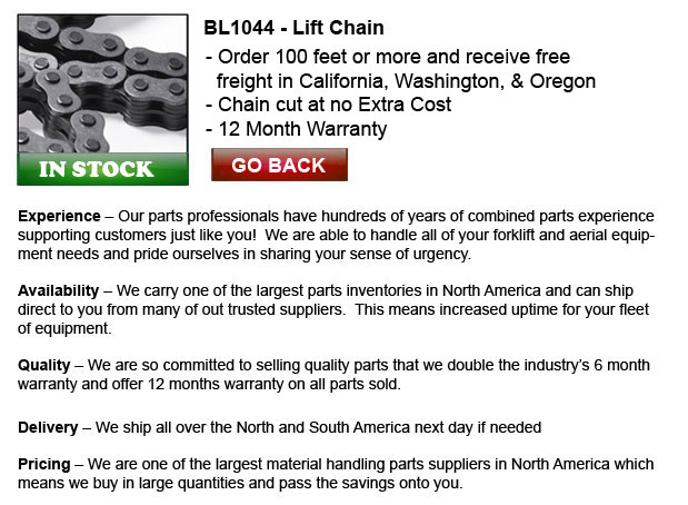 TOLL FREE: 1-888-633-0283 www.forkliftmastchain.com Email Us Lift Parts Express prides itself on the diversity and volume of parts we carry. Regardless of the model of lift truck you run, we have the parts you need. The cost savings we can offer will... About Us | ||
